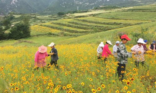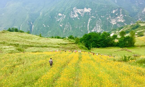 第一站:九寨溝縣羅依鄉。這里盛產高原雪菊。高原雪菊是菊花茶的一種,它也是九寨溝羅依鄉當地的時令特產,每年七八月份,正是雪菊成熟的時節,羅依鄉的一千畝的雪菊一片金黃,整個山丘被妝扮成雪菊花的海洋。吃過早飯,合作社里的30多個村民已經忙活起來,收摘雪菊。“天下雨了就摘不成了,天氣晴好就要收摘,還得地抓緊時間!”九寨溝縣羅依鄉大寨村村民劉月蓮給記者介紹。
